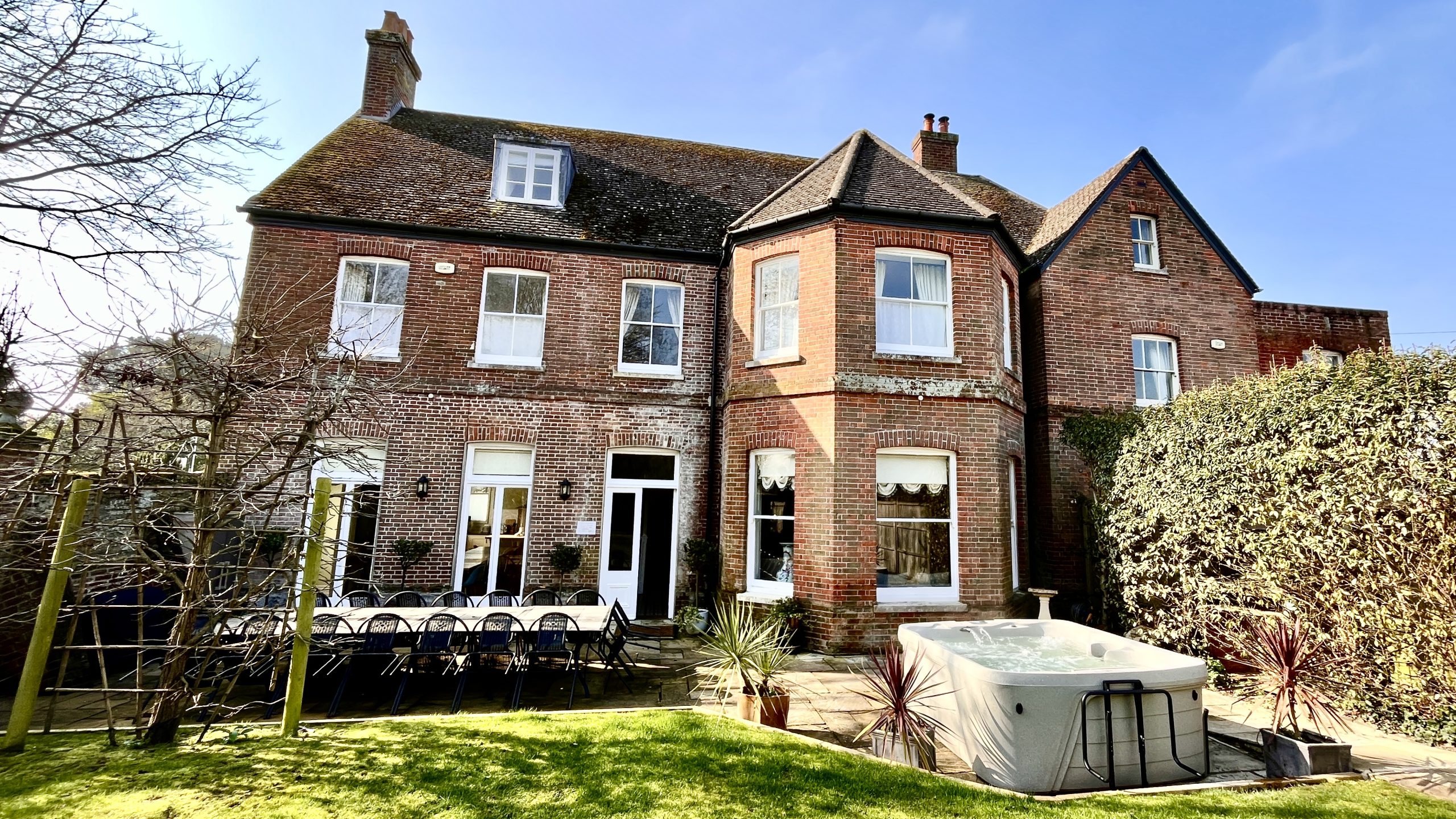 | Garden | Large garden and patio seating and tables for up to 25 people. Adjoining annexe with indoor Hot tub. Hot tub in the garden with Priory views. Out house for storage of bicycles, fishing tackle etc. Parking for up to 8 cars is provided. |